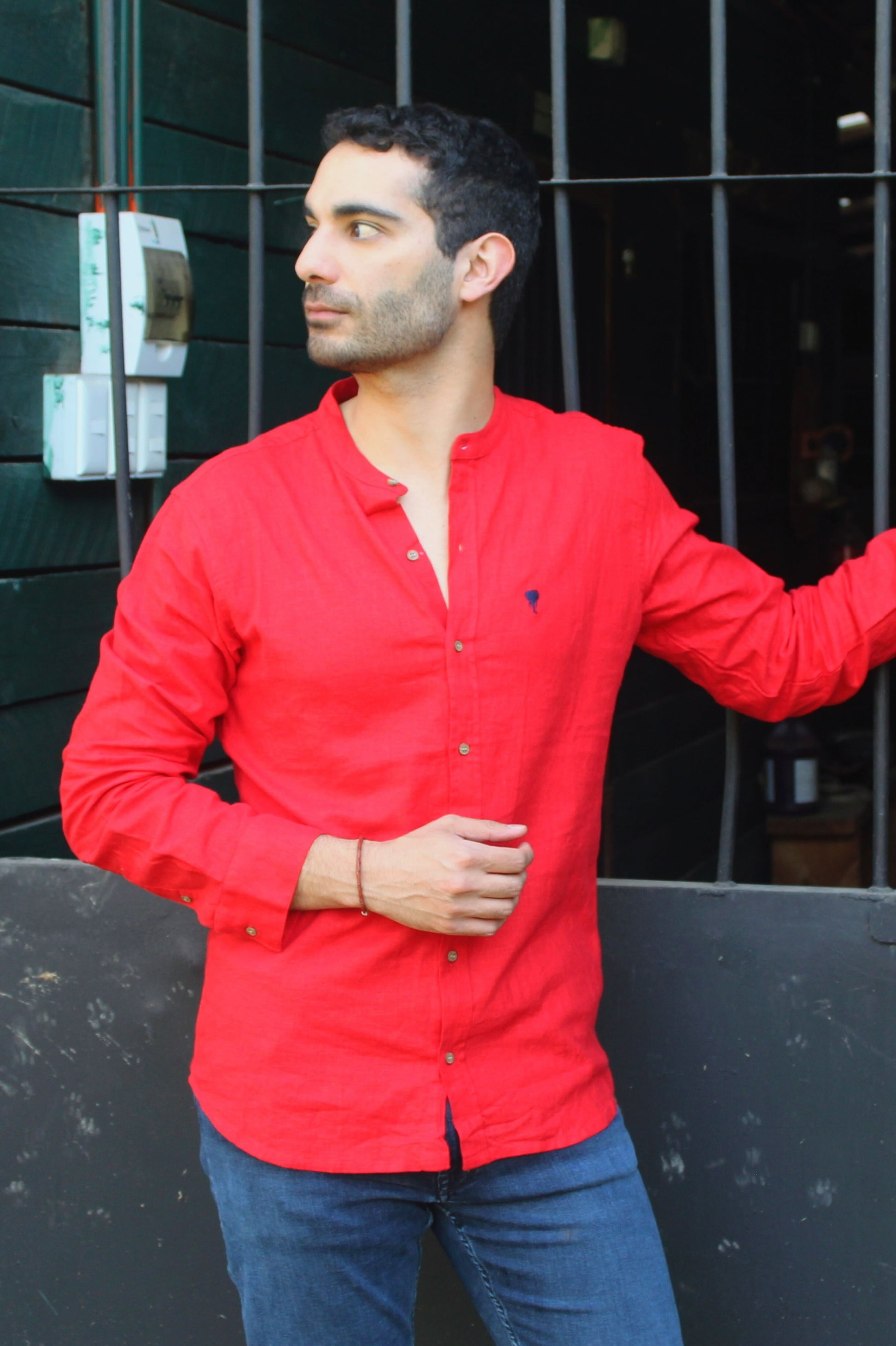 Camisa Roja Mao de hombre 80% lino y 20% viscosa hecha en India, con un diseño versátil y elegante.